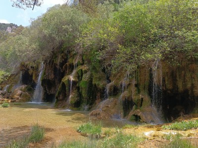 El Nacimiento del río Cuervo es uno de los parajes más emblematicos de la provincia de Cuenca. Ademas de la belleza paisajistica de este lugar, cabe destacar que se trata de una zona protegida como Monumento Natural por la importancia biologica y, sobre todo, geomorfologica del lugar por tratarse de un ejemplo sobresaliente de paisaje calcareo y estando catalogado como Lugar de Interes Geologico (LIG IB085) por el Instituto Geologico y Minero de España (IGME). Los protagonistas del paisaje son el agua, la roca y la abundante vegetación, elementos que conjugados dan lugar a las barreras de toba o travertino que represan continuamente el riachuelo, el cual se desploma en una bella cascada que se ha ido formando por la acumulación del carbonato calcico adherido a la vegetación, quedando petrificada. Las abundantes precipitaciones y la altitud de la zona propician dentro del Monumento Natural, la presencia de especies de flora y fauna protegidas, algunas incluso amenazadas. Entre las especies vegetales, el pino albar es la más abundante y evidente, seguida de la sabina rastrera que se localiza en las cumbres más frías y expuestas. También son destacables las diversas especies de orquídeas terrestres que se pueden localizar.